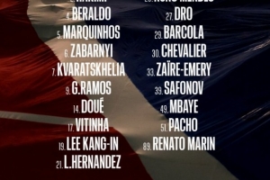 前锋:7-克瓦拉茨赫利亚、9-贡萨洛·拉莫斯、14-杜埃、29-巴尔科拉、49-姆巴耶