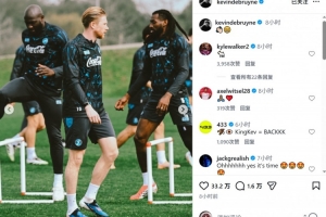 德布劳内肌肉受伤接受手术,自去年10月25日以来一直缺席。现在德布劳内已经恢复训练,他在社交媒体上晒出训练照片,并配上笑脸的表情符号。